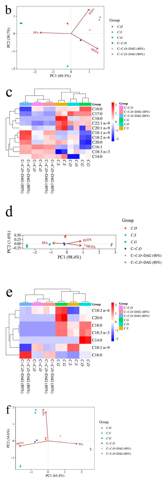Cluster heat map and principal component analysis (PCA) were conducted for six types of camellia oils using the following variables: (a) cluster heat map of the total fatty acids, (b) PCA of total SFAs, MUFAs, and PUFAs, (c) cluster heat map of the sn-1,3 position of fatty acids, (d) PCA of sn-1,3 position of total SFAs, MUFAs, and PUFAs, (e) cluster heat map of the sn-2 position of fatty acids, and (f) PCA of the sn-2 position of fatty acids of total SFAs, MUFAs, and PUFAs. SFAs, saturated fatty acids; MUFAs, monounsaturated fatty acids; PUFAs, polyunsaturated fatty acids; C.O, C. oleifera; C.S, C. semiserrata), C.G, C. gauchowensis; C-C.O, commercial C. oleifera; C-C.O-DAG (40%), commercial C. oleifera diacylglycerol oil (40%); and C-C.O-DAG (80%), commercial C. oleifera diacylglycerol oil (80%).