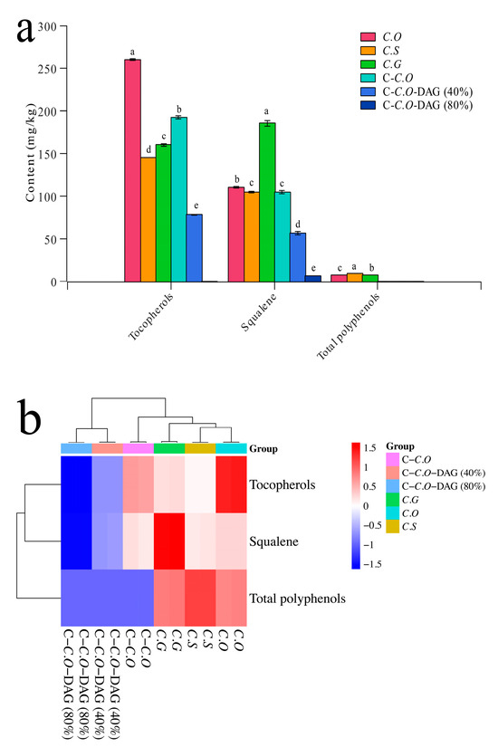 Comparison of tocopherols, squalene, and total polyphenols in different types of camellia oil (a), and cluster heat map with tocopherols, squalene, and total polyphenols in different types of camellia oil as variables (b). Mean values with different letters in are significantly different from each other at p < 0.05. C.O, C. oleifera; C.S, C. semiserrata); C.G, C. gauchowensis; C-C.O, commercial C. oleifera; C-C.O-DAG (40%), commercial C. oleifera diacylglycerol oil (40%); and C-C.O-DAG (80%), commercial C. oleifera diacylglycerol oil (80%).