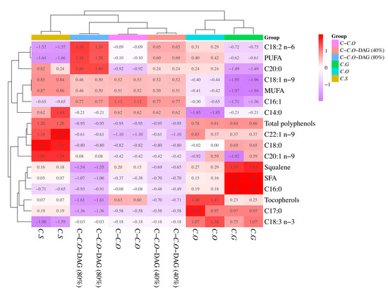 Cluster heat map of bioactive components of different types of camellia oils. C.O, C. oleifera; C.S, C. semiserrata); C.G, C. gauchowensis; C-C.O, commercial C. oleifera; C-C.O-DAG (40%), commercial C. oleifera diacylglycerol oil (40%); and C-C.O-DAG (80%), commercial C. oleifera diacylglycerol oil (80%).