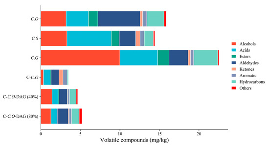 Classification of volatile compounds in different types of camellia oils. C.O, C. oleifera; C.S, C. semiserrata; C.G, C. gauchowensis; C-C.O, commercial C. oleifera; C-C.O-DAG (40%), commercial C. oleifera diacylglycerol oil (40%); and C-C.O-DAG (80%), commercial C. oleifera diacylglycerol oil (80%).