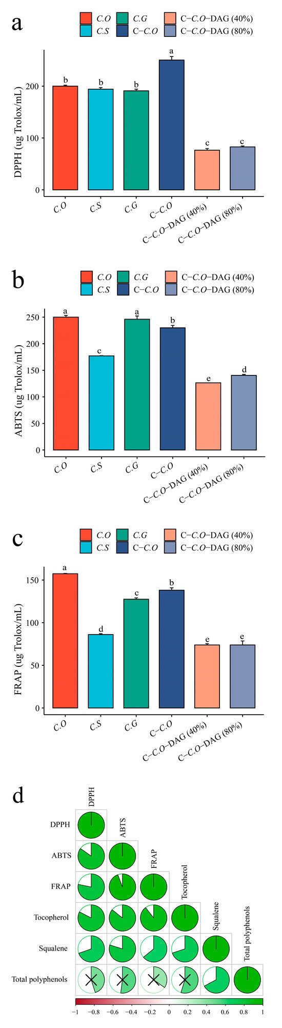 Antioxidant activity abilities of different types of camellia oils and correlated with their bioactive components. (a) DPPH radical scavenging abilities, (b) ABTS radical scavenging abilities, (c) FRAP abilities, and (d) correlations of between antioxidant activity abilities and bioactive components in different types of camellia oils. Mean values with different letters are significantly different from each other at p < 0.05. C.O, C. oleifera; C.S, C. semiserrata; C.G, C. gauchowensis; C-C.O, commercial C. oleifera; C-C.O-DAG (40%); commercial C. oleifera diacylglycerol oil (40%); and C-C.O-DAG (80%), commercial C. oleifera diacylglycerol oil (80%).