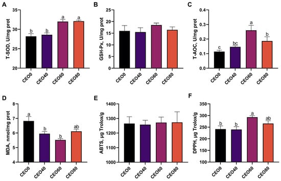 Effects of dietary supplementation with cocrystals of essential oils (CEO) on antioxidant capacity of the breast muscle in broilers. (A) T-SOD; (B) GSH-Px; (C) T-AOC; (D) MDA; (E) ABTS; (F) DPPH. CEO0, CEO40, CEO60, and CEO80 were the basal diet supplemented with 0, 40, 60, and 80 mg/kg cocrystals of thymol and carvacrol, respectively. Values are expressed as the mean and standard error of the mean (SEM). n = 8. a,b,c Means with different lowercase letters differ significantly among the four treatments (p < 0.05).
