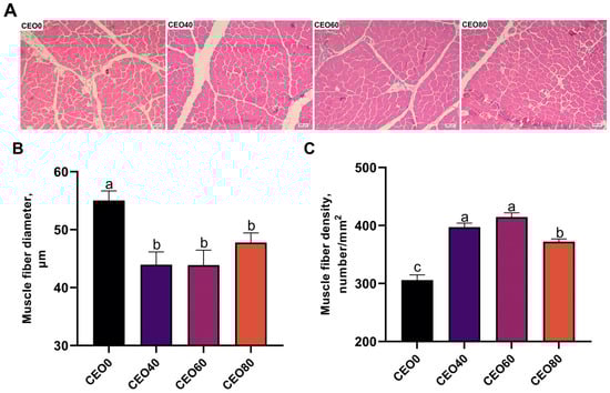 As shown in Figure 2, compared with the control group, CEO supplementation significantly decreased the breast muscle fiber diameter (p < 0.05) and significantly increased the breast muscle fiber density (p < 0.05). In addition, broilers in the CEO40 and CEO60 groups had significantly higher breast muscle fiber densities than broilers in the CEO80 group (p < 0.05).