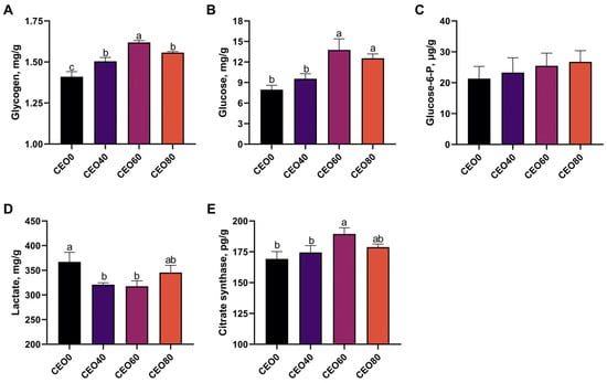 Effects of dietary supplementation with cocrystals of essential oils (CEO) on glucose metabolism in the breast muscle in broilers. (A) Glycogen; (B) Citrate synthase; (C) Glucose-6-P; (D) Lactate; (E) Citrate synthase. CEO0, CEO40, CEO60, and CEO80 indicate the basal diet supplemented with 0, 40, 60, and 80 mg/kg cocrystals of thymol and carvacrol, respectively. Values are expressed as the mean and standard error of the mean (SEM). n = 8. a,b,c Means with different lowercase letters differ significantly among the four treatments (p < 0.05).