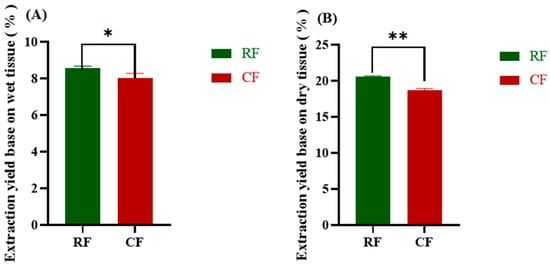 (A) Wet weight extraction rates of collagen from southern catfish skin under raw (RF) and cooked (CF) conditions. (B) Dry weight extraction rates of collagen from southern catfish skin under raw (RF) and cooked (CF) conditions. * denotes a significant difference between RF and CF (p < 0.05). ** indicates highly significant differences (p < 0.01).