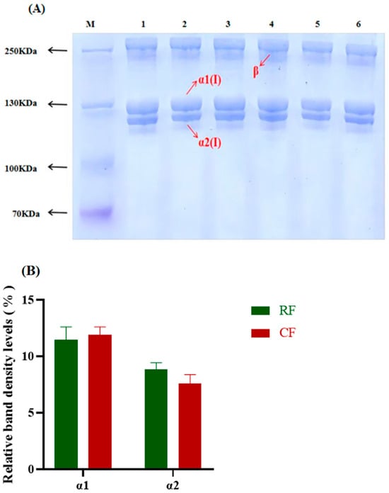 (A) SDS-PAGE results of skin collagen from southern catfish skin under raw food (RF) and cooked food (CF) feeding. M: Marker; 1–3: RF feeding; 4–6: CF feeding. (B) Relative band density levels of α1 and α2 chains.