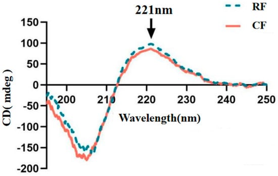 Figure 4 shows the results of CD spectra analysis of southern catfish skin collagen. CD spectra provide information on the secondary structure of collagen []. All collagens showed a rotatory maximum at 221 nm and a crossover point (zero rotation) at about 212 nm, which are typical characteristics of the collagen triple helical conformation [,]. The single negative absorption peak indicated a predominantly β-folding, which is consistent with the typical characteristics of type I collagens [], which have a complete triple helical structure. These peaks are important markers for determining collagen type. The maximum positive UV absorption peak of southern catfish skin collagen was 221 nm in both RF and CF groups, indicating a standard collagen triple helix structure with biological activity in both groups, which were suitable for denaturation temperature measurements and fibril formation experiments, yet there was no significant difference between the CF and RF groups. Previous studies reported a maximum UV absorption peak of 235 nm for collagen extracted from pufferfish (Lagocephalus inermis) skin and 220 nm for jellyfish (Acromitus hardenbergi) [,]. These varying results suggested that collagen raw materials and extraction methods affected the UV absorption peaks of collagen, which may be related to the exposure of the chromogenic modes in the collagen peptide chain [].