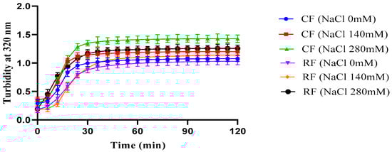 The slope of the turbidity curve reflects the rate of fibril formation, while the final turbidity reflects the fibril diameter to some extent []. In the present study, the growth period of collagen fibril formation appeared to be faster, with higher final turbidity and coarser fibril diameters in CF than in RF under the same salinity conditions. Different NaCl concentrations lead to different ionic strengths of the solution, which affect the assembly process of collagen molecules []. The slope of collagen fibril formation was minimum at a salinity of 0 mM and maximum at a salinity of 280 mM. This suggests that increasing NaCl concentration within a certain range promotes collagen fibril formation of both RF and CF groups. We speculate that the possible reason is that increased NaCl concentration results in enhancing ionic interactions, which may promote more effective fibril assembly and cross-linking. The result that increased salinity accelerates collagen fibril formation in southern catfish is similar to our previous findings in sturgeon and grass carp collagen [,,]. The general principles of collagen fibril formation are accepted, but the molecular mechanism of the assembly process is less known.