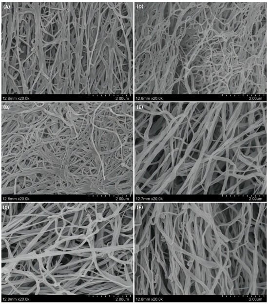 Scanning electron microscope images of collagen fibrils obtained from the skin of southern catfish. (A–C): raw food (RF) feeding, NaCl concentration was 0 mM, 140 mM, and 280 mM, respectively; (D–F): cooked food (CF) feeding, NaCl concentration was 0 mM, 140 mM, and 280 mM, respectively.