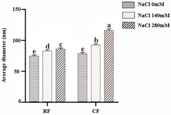 Effect of salinity on the diameter of skin collagen fibrils from southern catfish skin under raw food (RF) and cooked food (CF) feeding (n = 150, unit in nm). Different lowercase letters indicate differences among different salinities and groups (p < 0.05).
