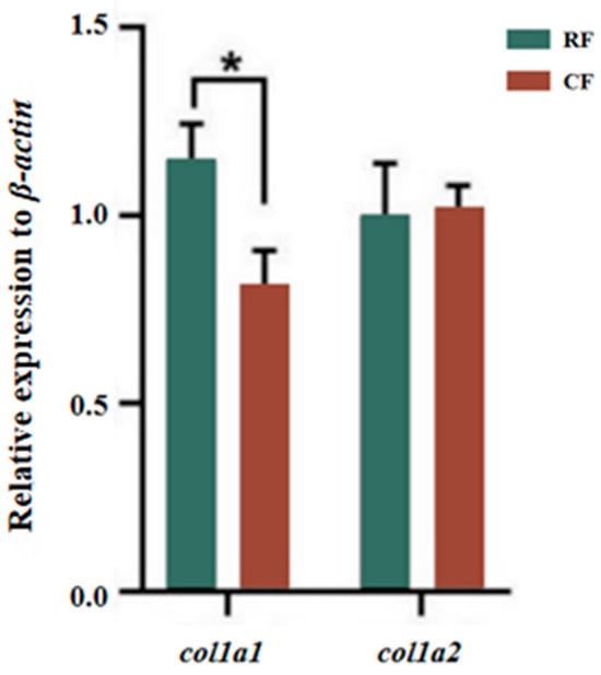 Effects of different feeding modes on gene expression of type I collagen in southern catfish skin. RF, raw food feeding; CF, cooked food feeding. * Indicates significant differences among different salinities (p < 0.05).