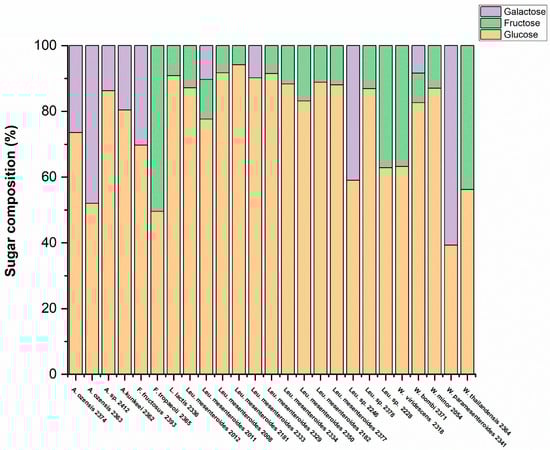 - Fuso, A.; Bancalari, E.; Castellone, V.; Caligiani, A.; Gatti, M.; Bottari, B. Feeding lactic acid bacteria with different sugars: Effect on exopolysaccharides (EPS) production and their molecular characteristics. Foods 2023, 12, 215. [Google Scholar] [CrossRef]