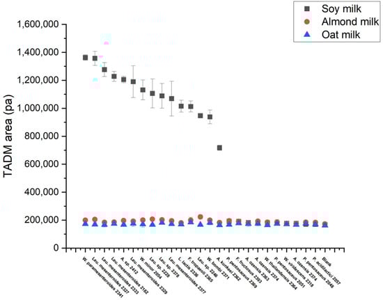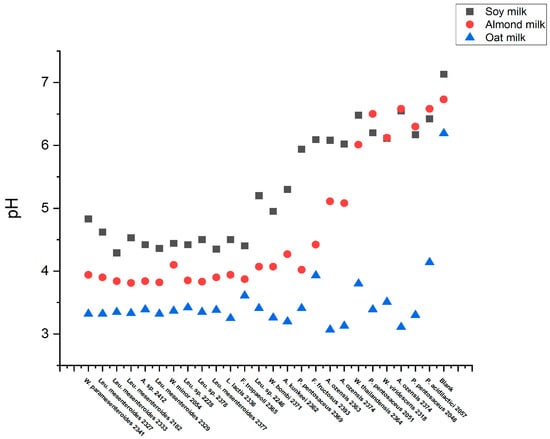 - Huang, W.; Dong, A.; Pham, H.T.; Zhou, C.; Huo, Z.; Wätjen, A.P.; Prakash, S.; Bang-Berthelsen, C.H.; Turner, M.S. Evaluation of the fermentation potential of lactic acid bacteria isolated from herbs, fruits and vegetables as starter cultures in nut-based milk alternatives. Food Microbiol. 2023, 112, 104243. [Google Scholar] [CrossRef]