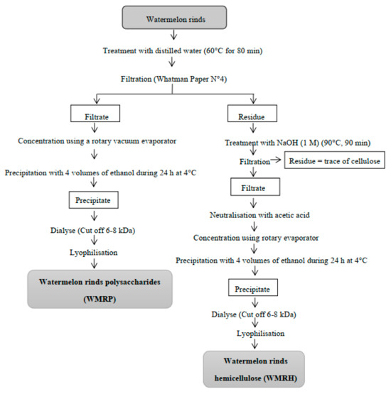 - Ben Romdhane, M.; Haddar, A.; Ghazala, I.; Jeddou, K.B.; Helbert, C.B.; Ellouz-Chaabouni, S. Optimization of polysaccharides extraction from watermelon rinds: Structure, functional and biological activities. Food Chem. 2017, 216, 355–364. [Google Scholar] [CrossRef] [PubMed]
