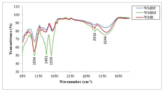 The FT-IR spectrum of the WMR powder, WMRP, and WMRH was obtained utilizing a Fourier transform infrared spectrophotometer (Perkin Elmer Spectrum BX FT-IR, Shelton, CT, USA). The sample was ground and mixed with spectroscopic-grade potassium bromide (KBr) powder and subsequently pressed into 1 mm disks. The results were recorded within the wavenumber range of 4000–400 cm−1 [31].