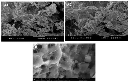 SEM micrographs of WMR and WMRH with different magnifications: WMR (50, 10 μm, ×500 (A1), ×1000 (A2), 10 kV) and (B) WMRH (10 μm, ×2500, 10 kV).