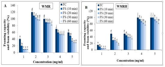 Foaming capacity and stability of the WMR (A) and WMRH (B) at different concentrations. Each value represents the average of three biological replicates ± SD. Same letter above the bars shows the statistical differences between the tested samples and the standard.