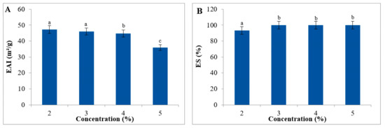The emulsifying properties of the samples were evaluated using a partially modified turbidimetric method [34]. Fifty milliliters of each suspension at different concentrations (1, 2, 3, 4, and 5%; w/v) was mixed with 10 mL of soybean oil and homogenized for 3 min at 20 °C. Samples of the emulsion (50 µL) were immediately extracted from the bottom of the container and, after 10 min, diluted with 5 mL of 0.1% sodium dodecyl sulfate (SDS) solution. Subsequently, the absorbance of the diluted emulsions was measured at 500 nm using a spectrophotometer (UV mini 188 1240, UV/VIS spectrophotometer, SHIMDZU, Beijing, China). The emulsifying capacity was established based on the absorbance measured right after emulsion formation. Subsequently, the emulsion activity index (EAI) was determined using Equation (6):