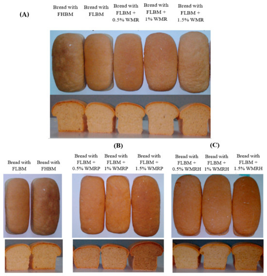 The dough was created by blending these components: 300 g of wheat flour, 4.8 g of sucrose, 5.75 g of sodium chloride, 3 g of wet compressed yeast (Saccharomyces cerevisiae), 12 mL of soybean oil, and 195 mL of water. After kneading and fermentation, the dough was baked for 3 h in a bread maker (Home Carrefour HBM1228, Massy, France). The various ingredients were initially placed in the bread pan and kneaded for 14 min. The resulting dough underwent a 20 min fermentation before a second 20 min kneading. Subsequently, the dough rested undisturbed at room temperature for 30 min following kneading. Dough made with high-quality bread-making wheat flour (FHBM) was employed as the positive control, while dough made with low-quality bread-making wheat flour (FLBM) served as the negative control. The FLBM was supplemented with varying amounts (0.5%, 1%, and 1.5%) of WMR, WMRP, and WMRH to examine their influence on the textural and nutritional aspects of bread.