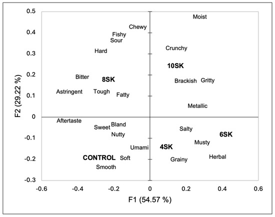 The consumers identified their sensory perception using a CATA question (Figure 1 and Supplementary Table S1). The first two dimensions of the correspondence analysis explained 83.79% of the variation (54.57% on the first dimension and 29.22% on the second dimension). The 8SK and 10SK samples were separated from the other samples by the second dimension and, in turn, were separated from each other by the first dimension. The 8SK sample was associated with astringent, tough, bitter, fatty, hard, sour, fishy, and chewy. While the 10SK was perceived to be crunchy, brackish, metallic, gritty, and aftertaste. Samples 4SK and 6SK were grouped and associated with salty, musty, grainy, and herbal. The control sample was associated with smooth, soft, umami, nutty, bland, sweet, and moist attributes. The participants separated the samples based on the amount of sugar kelp addition.