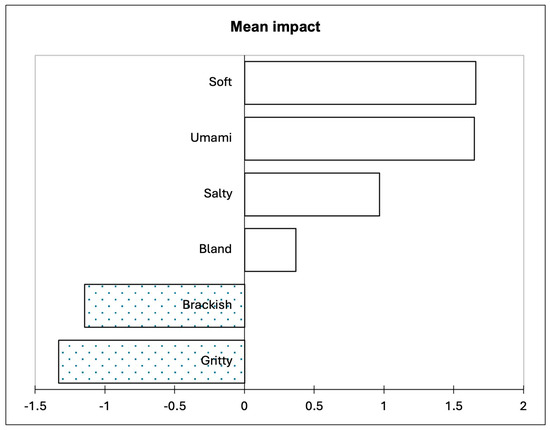 The overall liking scores were used in conjunction with the sensory properties from the CATA question to conduct a penalty lift analysis (Figure 2). Soft and umami had the largest positive impact on consumer liking, followed by salty and bland. Brackish and gritty were identified to negatively affect the consumers’ liking.
