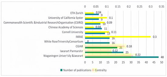 Figure 5 shows that INRAE had the highest centrality at 0.3, followed by Wageningen University & Research at 0.22, and CGIAR at 0.18. A few research institutions had a centrality of less than 0.1 in global sustainable agri-food supply chains. Moreover, high centrality does not necessarily correlate with high productivity, as seen with INRAE. Therefore, institutions with solid centrality should intensify their research efforts and increase their publication output to leverage a radiating effect within the field.