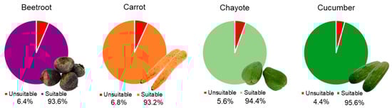 Examples of the vegetables collected (beetroot, carrot, chayote, and cucumber) and classified as “unsuitable” and “suitable”.