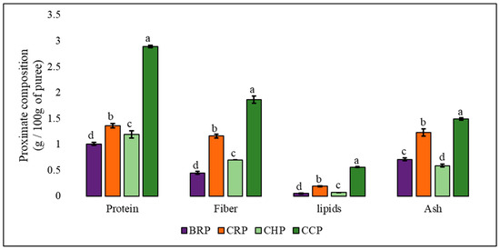 Analysis of the proximal composition of purees made from vegetables wasted in supermarkets. Note: BRP = beetroot puree; CRP = carrot puree; CHP = chayote puree; CCP = cucumber puree. Different letters in the same analysis indicate significant differences between the average values using Duncan’s test (p ≤ 0.05).