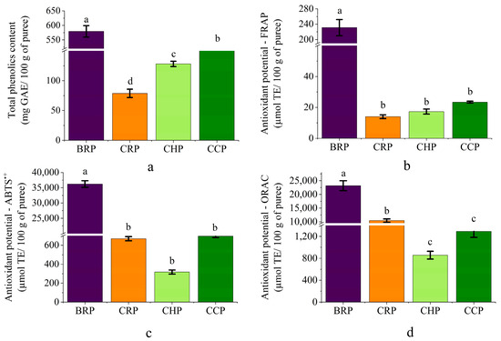 The beetroot puree was found to have a significantly higher concentration of total phenolics than the other purees evaluated (Figure 3). According to Wruss et al. [49], beets have a high concentration of betalains (plant pigments), which, although not part of the phenolic compound class, have an impact on total phenolic concentrations. The authors found that the concentration of total phenolics in beetroot-based products is linearly dependent on the concentration of betalains. Thus, the higher concentration of total phenolics observed in beetroot puree may be associated with the high concentration of betalains present in the vegetable.