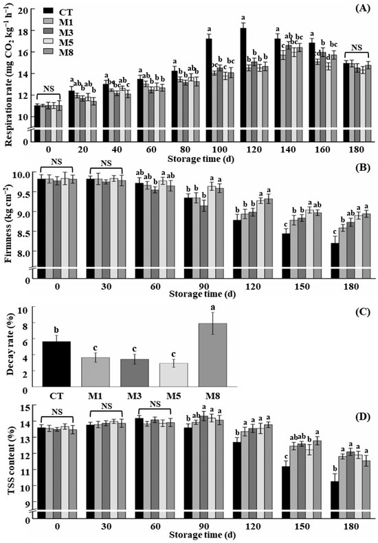 Effects of different concentrations of 1-MCP on the quality of stored apple. (A) Respiration intensity; (B) firmness; (C) decay rate; (D) total soluble solid (TSS) content. CT, M1, M3, M5, and M8 were treated with 1-MCP concentrations of 0 µL·L−1, 1 µL·L−1, 3 µL·L−1, 5 µL·L−1, and 8 µL·L−1, respectively. The vertical bars indicate ± standard deviation of the means (n = 3). Different letters indicate significant differences among different treatments at p < 0.05. NS means no significant difference.