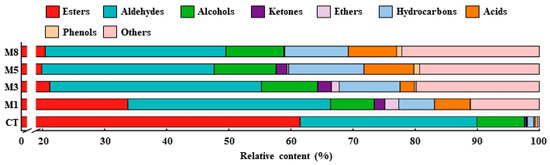 Figure 2 shows the differences in the volatile components of the apples treated with different concentrations of 1-MCP and stored for 180 days. It can be seen from Table 1 and Figure 2 that when the apples was stored for 180 days, the volatile components of the fruit (CT group) were esters, alcohols and aldehydes, accounting for more than 97% of the total volatile components, and their relative contents were 61.5%, 7.62%, and 28.46%, respectively. As shown in Table 1, 1-MCP treatment significantly inhibited the ester components in the fruits, which may have been related to the subsequent physiological chain reaction blocked by 1-MCP inhibiting ethylene synthesis and binding to its receptor protein. The 1 µL·L−1 1-MCP treatment significantly reduced the ester components of the fruits by 45.09% (Table 1), and the higher concentration of 1-MCP showed a greater inhibitory effect. In addition, the aldehydes in the fruits in the group treated with 1–3 µL·L−1 1-MCP were slightly higher than those in the CT group (Table 1), while the higher 1-MCP concentration had little effect on aldehydes. For alcohols, 1-MCP at a 1 µL·L−1 concentration had little effect on the alcohol components (Table 1), while the proportion of alcohol components increased slightly at higher 1-MCP concentrations (the M3, M5, and M8 groups).