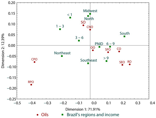 Figure 1 presents the correlation analysis based on the type of oil most consumed by respondents (soybean oil (SO), palm oil (RPO), olive oil (OO), palm kernel oil or crude palm oil (CPO), canola oil (RO), corn oil (CO), sunflower oil (SFO), sesame oil (SEO), coconut oil (CNO)), the region of residence (north, northeast, south, midwest, southeast), and their income level (less than 1 minimum wage, between 1 and 3 minimum wages, between 3 and 6 minimum wages, between 6 and 9 minimum wages, more than 9 minimum wages, prefer not to disclose), consisting of two dimensions (dimension 1 and dimension 2, demonstrating 84.30% data correlation). The analysis revealed a significant correlation between minimum wage income and soybean and coconut oil consumption in the midwest and north regions. On the other hand, the consumption of olive oil, sunflower oil, and corn oil, which generally have higher prices, is associated with income above six minimum wages and residence in the southeast region (Figure 1).