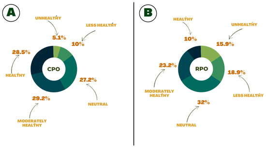 When asked how healthy respondents considered CPO, the majority declared it healthy or moderately healthy. However, less than half of the participants thought of RPO in this way. This reflects the participants’ good understanding of these oils, as they comprehend that refining CPO makes it somewhat less healthy. This process leads to a reduction in carotenoids, vitamin E, and sterols, as well as the formation of compounds that can pose health risks, such as chloropropanols like 3-MCPD, 2-MCPD, and glycidol.