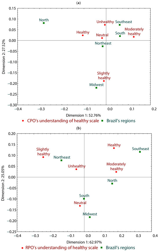 Correspondence analysis of understanding of healthiness of CPO (a) and RPO (b) by Brazil’s region in the survey participants.