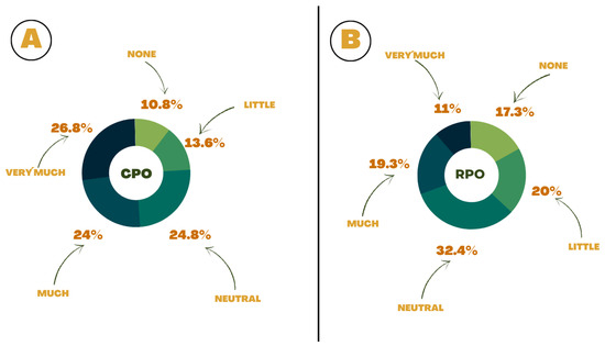 The refining of vegetable oils can generate food-originating contaminants that, according to the International Agency for Research on Cancer (IARC), can pose a carcinogenic risk in humans. However, 79.62% of respondents did not express an opinion or disagreed with the first statement in Figure S9, demonstrating that, despite the majority having a good education, this information is not known to respondents. Additionally, it is known that most CPOs produced (approximately 80%) are destined for refining in the food industry [50,51]. Still, 67.89% of individuals did not express an opinion or disagreed with the second statement. Regarding the third statement, 63.94% of respondents did not express an opinion or disagreed, showing that Brazilian consumers do not mind the presence of RPO in their food, which aligns with the 69.48% of respondents who did not claim to observe the presence of RPO on labels (Figure S8).