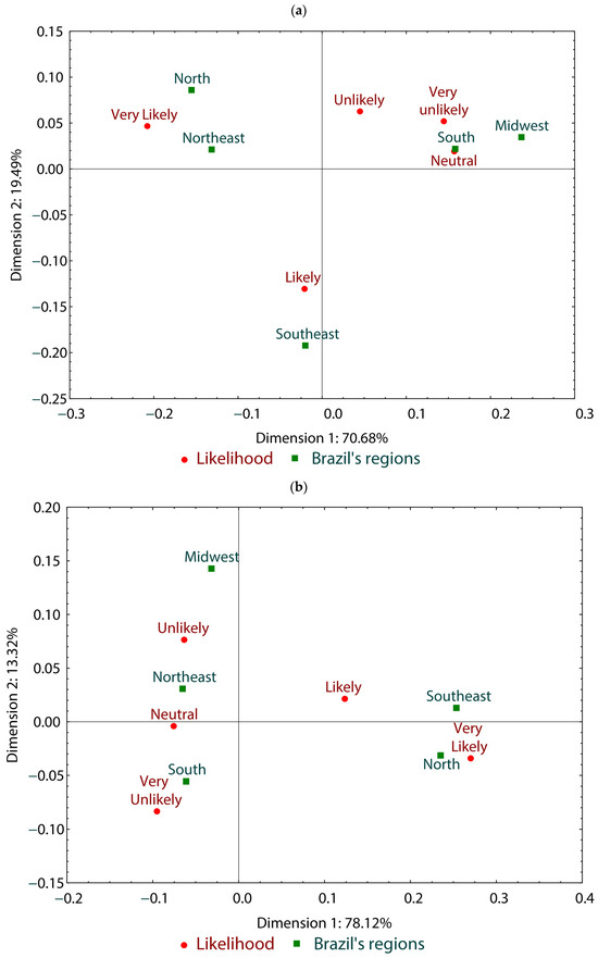 Figure 5 presents the results of correspondence analyses based on the purchasing trend of products containing CPO or RPO (very likely, likely, neutral, unlikely, very unlikely) and the geographical location of respondents (north, northeast, south, midwest, southeast). It consists of two dimensions (dimension 1 and dimension 2, demonstrating 90.17% data correlation). Regarding products containing CPO, the north and northeast regions showed a greater inclination to buy them, correlating with the option “very likely”. In contrast, the south and midwest regions remained indifferent or less inclined, connecting with the responses “neutral” and “very unlikely”. The southeast region showed a moderate inclination to buy them by correlating with the option “likely” (Figure 5a).