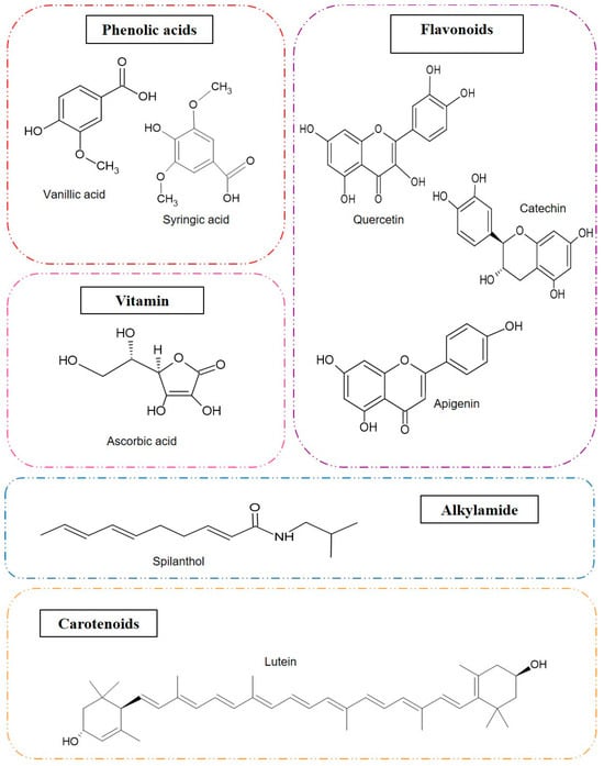 - Rahim, R.A.; Jayusman, P.A.; Muhammad, N.; Mohamed, N.; Lim, V.; Ahmad, N.H.; Mohamad, S.; Hamid, Z.A.A.; Ahmad, F.; Mokhtar, N.; et al. Potential Antioxidant and Anti-Inflammatory Effects of Spilanthes Acmella and Its Health Beneficial Effects: A Review. Int. J. Environ. Res. Public Health 2021, 18, 3532. [Google Scholar] [CrossRef] [PubMed]