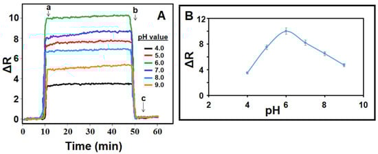 (A) SPR sensorgrams for 10.0 nM AA at different pHs of PBS. (B) Effect of pH on MIP/SPR chip: (a) adsorption; (b) desorption; (c) regeneration.