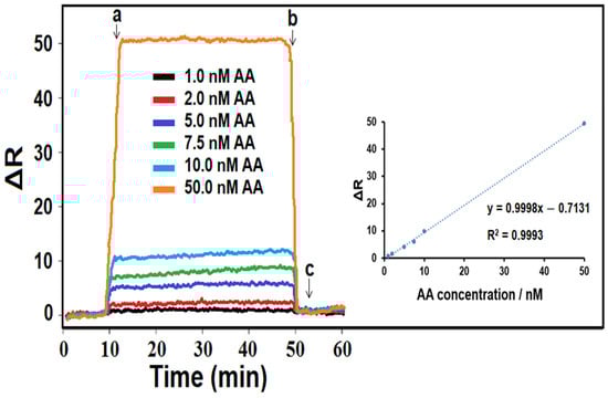 Effect of AA concentration on MIP/SPR chip. Inset: Calibration curve of AA concentrations of MIP/SPR chip in the presence of pH 6.0 of PBS (from 1.0 nM to 50.0 nM AA): (a) adsorption; (b) desorption; (c) regeneration.