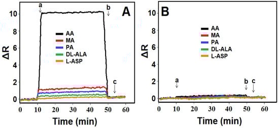 Selectivity tests: SPR sensorgrams of (A) MIP/SPR chip and (B) NIP/SPR chip in 10.0 nM AA, 1000.0 nM MA, 1000.0 nM PA, 1000.0 nM DL-ALA, 1000.0 nM L-ASP: (a) adsorption; (b) desorption; (c) regeneration.