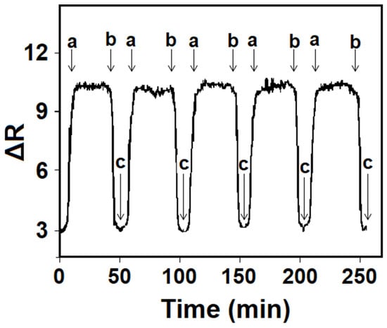 For the repeatability test of the developed MIP/SPR chip, five consecutive cycles in the presence of 10.0 nM AA were completed, and the obtained SPR signals for each cycle were almost close to each other with a relative standard deviation of 0.44%, providing high repeatability (Figure 5).