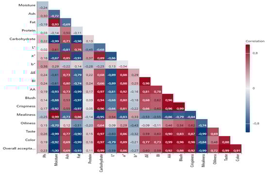 Figure 6 presents the correlation matrix showing the relationships between the independent variables in our study. Specifically, variables with positive correlations above 0.90 with AA and those with negative correlations below 0.90 were focused on, and it was found that the majority of these correlations were statistically significant (p < 0.05). A strong positive correlation was observed between the AA levels in potatoes and the parameters of blush (0.96), crispiness (0.96), color (0.99), taste (0.90), and overall acceptability (0.92). Additionally, when examining the correlation results with color parameters, positive correlations were determined with the a* value (0.92), and strong positive correlations were found with the ΔE (0.81) and BI (0.78) values. Conversely, a negative correlation (−0.81) was found between the L* value and AA levels. In summary, darker (lower L*), redder (higher a*), and browner (higher BI) fried potatoes tended to have higher AA levels. Furthermore, the total color difference (ΔE) was strongly related to AA, indicating that significant color changes during frying were associated with increased AA formation. Conversely, a strong negative correlation was found between the AA levels of fried potatoes of different sizes and their moisture levels (−0.93) and fat contents (−0.99). This indicates that samples with higher moisture and fat contents tended to have lower AA levels. This inverse relationship can be attributed to the fact that higher moisture content may diminish the extent of the Maillard reaction, which is a critical process in AA formation.