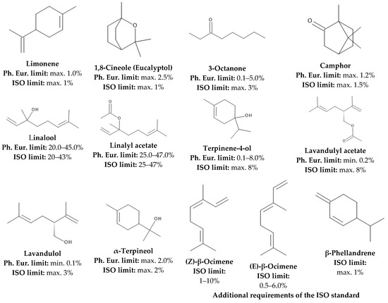 One of the most exigent quality requirements is set for its application in the pharmaceutical field. It is officially listed in the European Pharmacopoeia 11th Edition (Ph. Eur.) under the name of lavender oil (lat. Lavandulae aetheroleum). The monograph establishes requirements for both the quality of the raw material and the method of production. It is prescribed that the flowering tops of LA (Lavandula officinalis Chaix.) have to be used for steam distillation [6]. Regarding its composition, the pharmacopeia establishes acceptance limits for ten components. It should be mentioned that the European Pharmacopoeia clearly distinguishes lavender oil from Spike lavender oil, which is described in a separate monograph and is defined as essential oil obtained via steam distillation of the flowering tops of Lavanadula latifolia Medik [7]. The lavender flower (lat. Lavandulae flos) pharmacopeial monograph specifies that the minimum essential oil (relative to the anhydrous drug) content has to be 13 mL/kg [8]. Another major quality-requirement standard for lavender oil is the ISO 3515:2002 (International Organization for Standardization), which contains acceptance criteria for three additional components in comparison to the European Pharmacopoeia and distinguishes lavender oil obtained from plants of different origins as follows: France—from seed; France—Maillette; Bulgaria; Russia; and other origins [2]. Figure 1 illustrates the relevant quality requirements regarding the composition of lavender oil according to the above-mentioned quality standards: