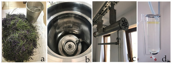 Parts of the semi-industrial-scale steam distillation system: perforated basket for biomaterial (a), bioreservoir with steam inlet ring (b), heat exchanger (c), and separation vessel (d).