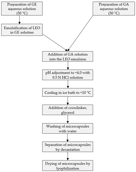 Freeze drying of microcapsules was performed in a Biobase BK FD10S (Biobase, Ji-nan, China) equipment by applying 4 h of freezing at −55 °C, followed by 20 h of drying under a vacuum of 10 Pa. The technological process of microcapsule formation is presented in the following flowchart (Figure 4).