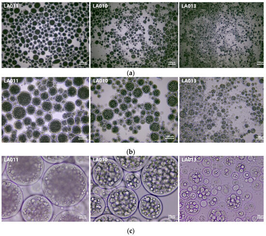 The polydispersity of microcapsule dimensions is well reflected on images at 40× and 100× magnifications. A polynucleated structure is predominantly characteristic to experiments incorporating the medium- and high-gel-strength gelatin. In the case of experiment no. LA013, prepared with gelatin of 80–120 Bloom, the mono- and oligonucleated forms are the most prevalent.