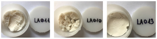 Macroscopic aspect of the lyophilized samples obtained with different gelatin grades (exp. no. LA011—300 Bloom; exp. no. LA010—175 Bloom; and exp. no. LA013—80–120 Bloom).