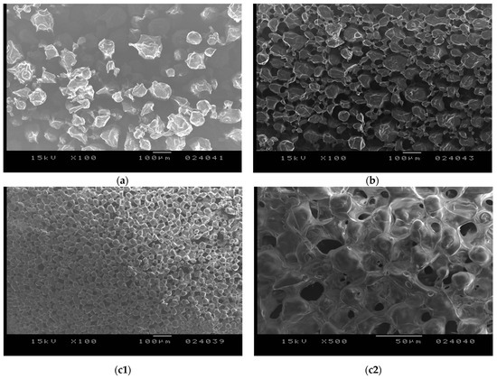 SEM image of freeze-dried microcapsules prepared with different gelatin grades: (a) experiment no. LA011, manufactured with gelatin, approx. 300 Bloom—100×; (b) experiment no. LA010, manufactured with gelatin, approx. 175 Bloom—100×; and (c1) experiment no. LA013, manufactured with gelatin, approx. 80–120 Bloom—100× and (c2) 500× magnification.