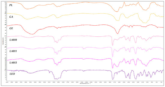 The FT-IR spectra of oil-free microcapsule (PL), gelatin (GE), gum arabic (GA), microcapsules prepared with three different gelatin grades (LA010, LA011, and LA013), and essential oil (LEO).