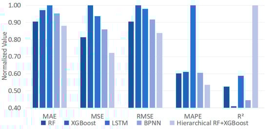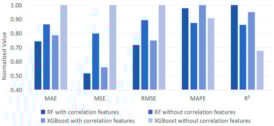 Figure 6 displays the results derived from RF and XGBoost with and without integrating the correction features in bamboo leaf sales forecasting. Here, data normalization shows the values of different evaluation metrics into the same range, allowing better investigation of the overall performances. The variations in